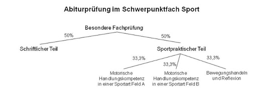 Die Abiturprüfung besteht aus einer Klausur mit 240-minütiger Bearbeitungszeit sowie einer dreiteiligen sportpraktischen Prüfung.